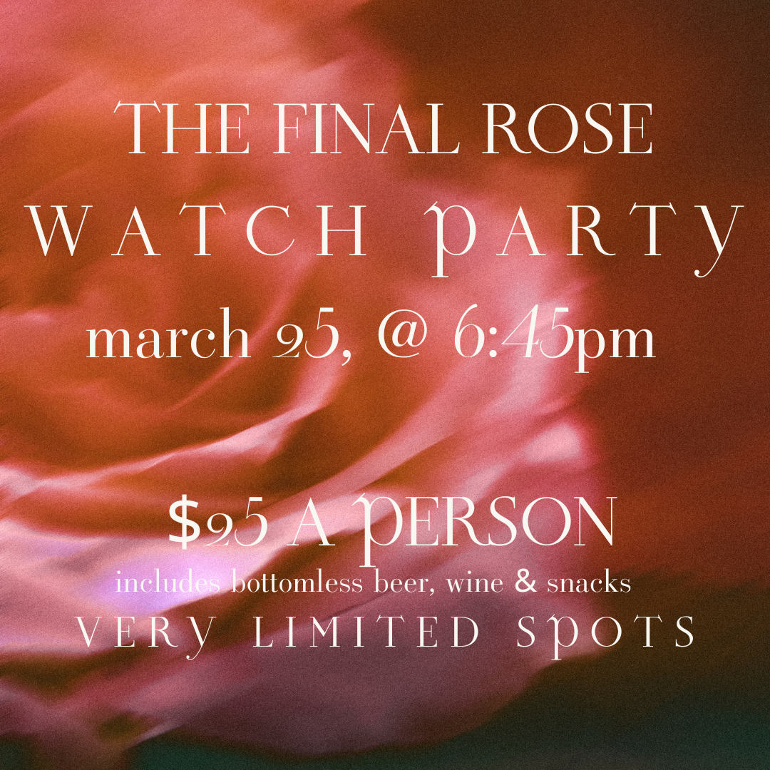 Join us March 25, 2024 for the Bachelor finale. $25 per person gets you bottomless beer, wine & snacks. MUST BE 21+ YEARS OF AGE TO PURCHASE A TICKET.Â