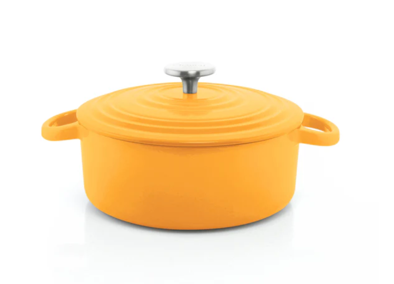 Top-grade enamel is applied to the interior and exterior of each piece. Enamel provides depth of color and is the healthiest cooking surface possible. Enamel is essentially a glass coating that will not leach metals into food and will not react with or alter flavors in your dish. The heavy cast lid keeps steam and condensation inside thus keeping all the flavor and nutrients in your food. Enameled cast iron will cook similarly to traditional cast iron but it will not have to be seasoned before use and cleanup has never been easier!