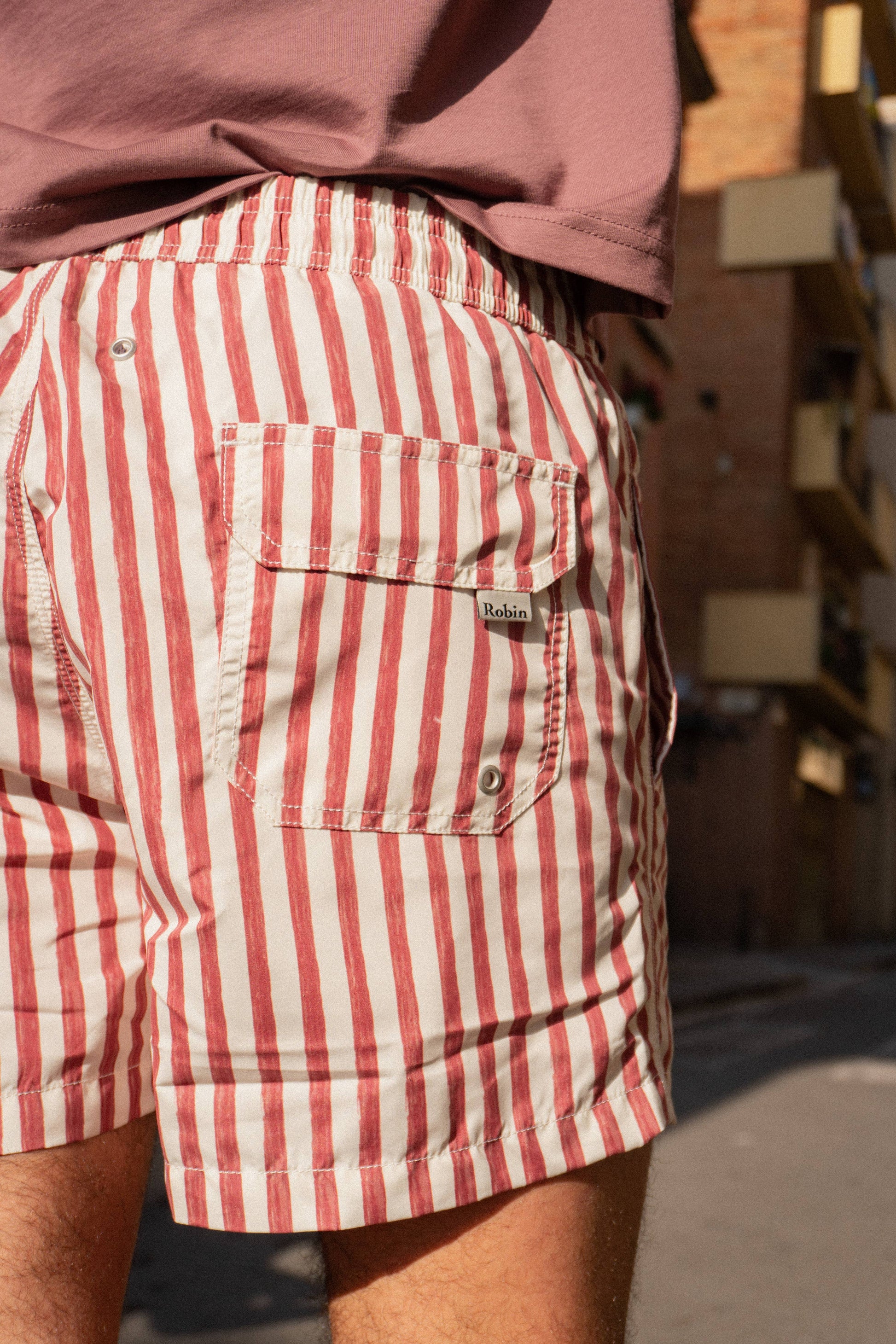 Style, comfort and quick drying were our premises when designing this regular-fit swimsuit. The Cherry Stripes model has a gradient striped print in blood red, a vintage style perfect for your favorite vacation destination.