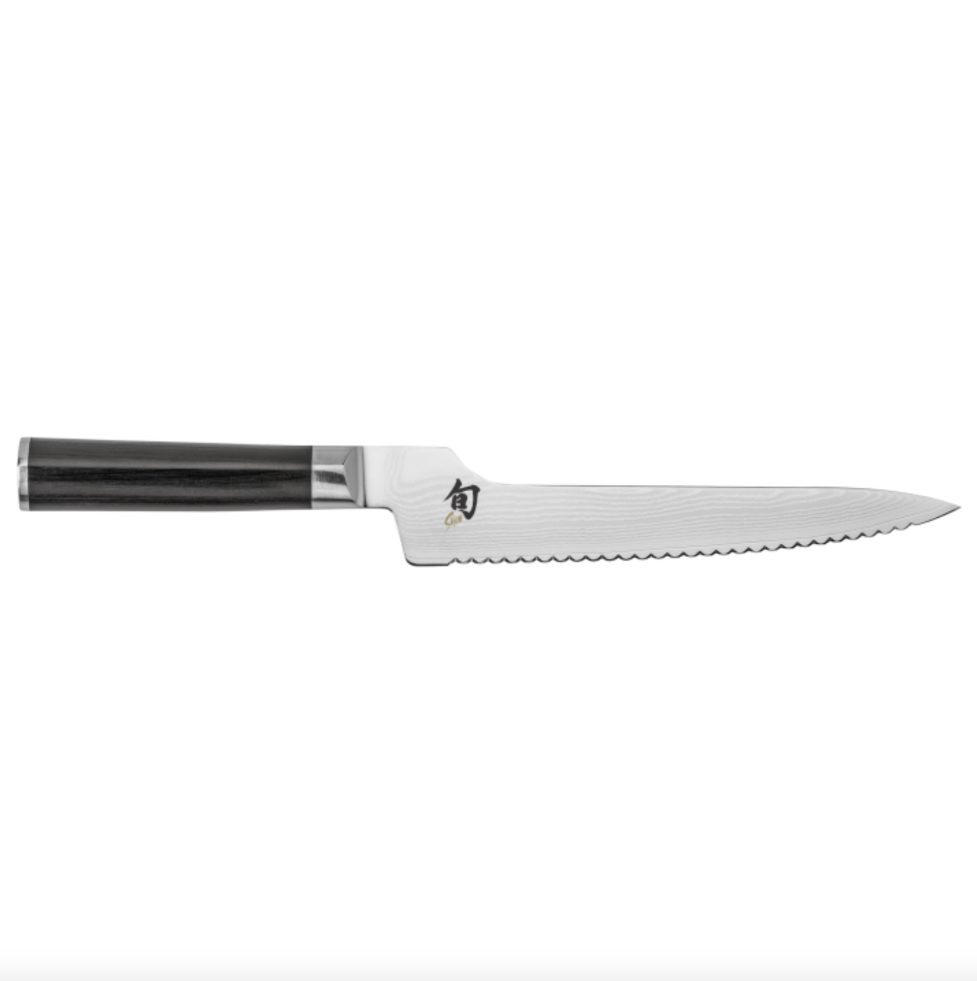Have you ever found yourself hovering over the edge of the cutting board so that you don't knock your knuckles on the board as you reach the bottom of the stroke? The Shun Offset Bread Knife solves the problem. The offset handle position creates additional knuckle clearance and perfectly positions your hand for a more powerful—and thus, easier—cut. The scalloped serrations will slice neatly into your loaf without skidding; no matter how crusty it is.
