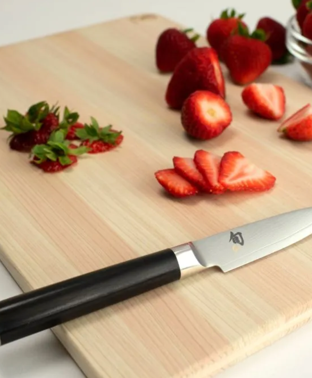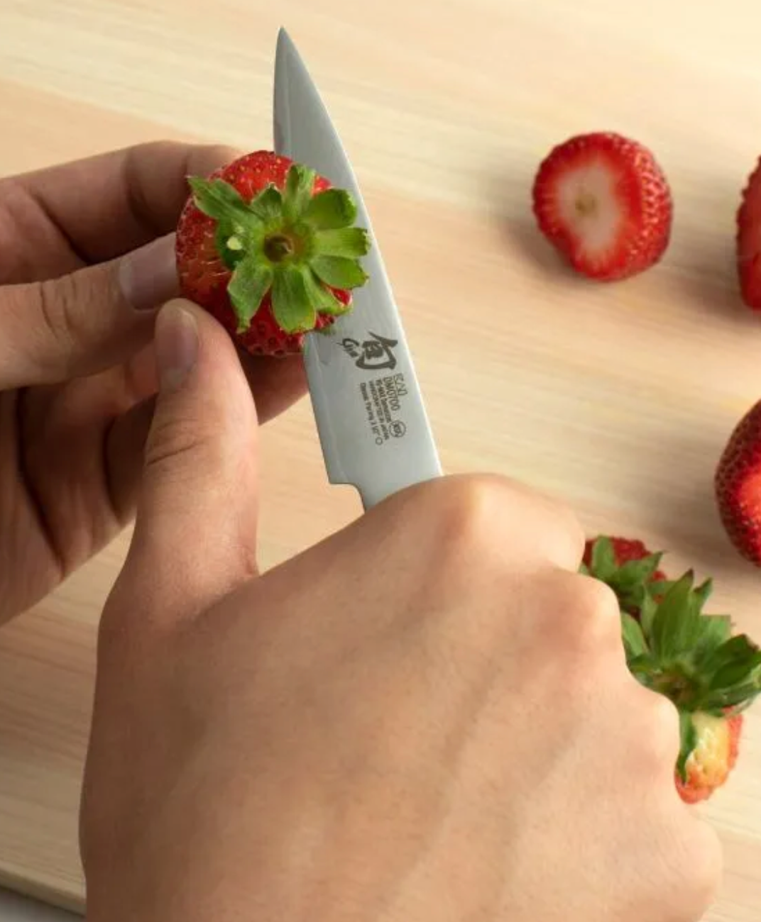 The Shun Classic Paring Knife is a must-have for every kitchen. Think of it as the mini version of the chef's knife because, like the chef's knife, the paring knife is quite versatile. It gets its name from its main function—removing or “paring” away things like peels or pits from fruits and vegetables. Its small size gives you complete control over the tip and edge of the blade. Generally, you use this knife in your hand rather than against a cutting board, though paring knives can also be used for cutting small foods, such as garlic cloves or ginger.