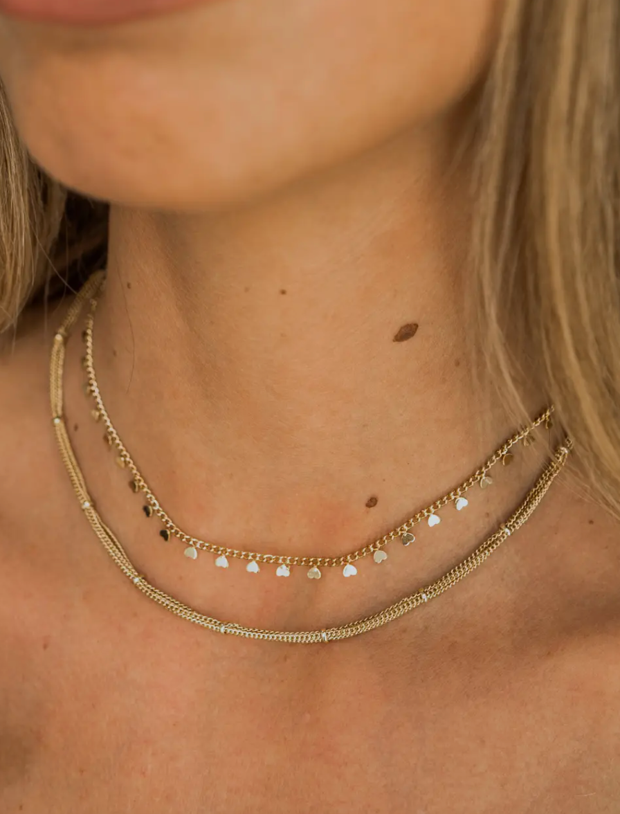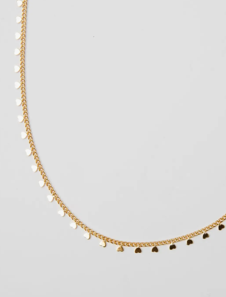 METAL 18K Gold Bonded SIZE 13" in length + 3" Extender DESIGNER NOTE Fall in love this season with The Corazones Choker featured just for you to glow right along with it. Gold metallic stranded hearts fall throughout the chain enhance that dainty neckline of yours. STYLE TIP: More than one love by styling up your eccentric dress with the Corazones and I Love Choker.... Handmade in the U.S.