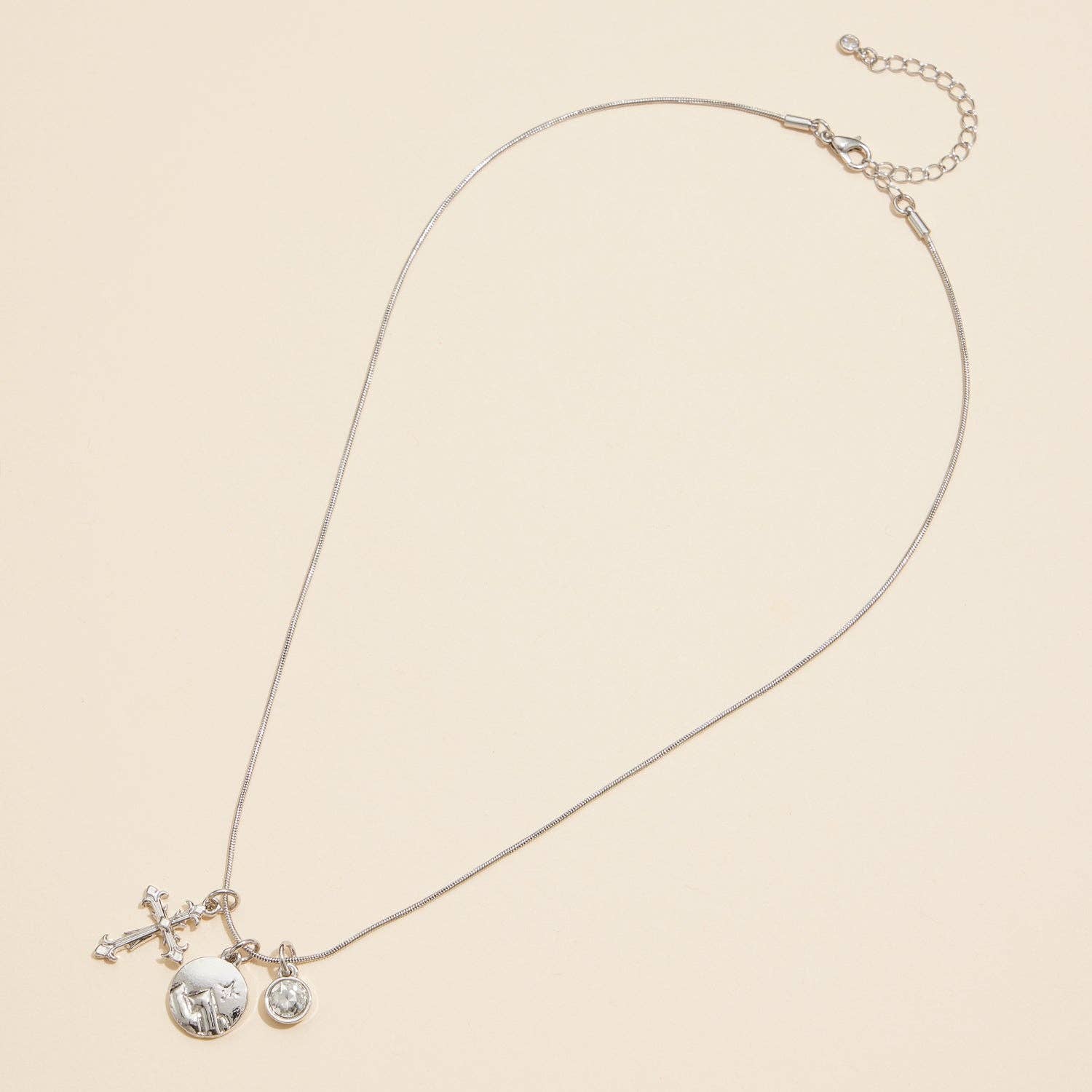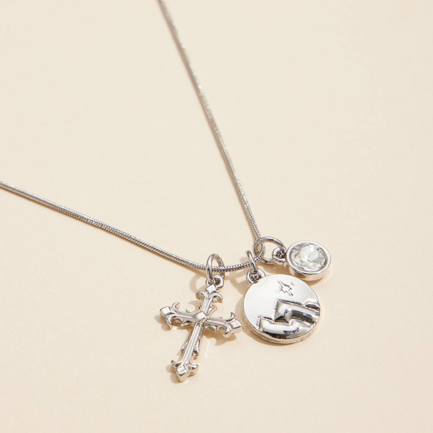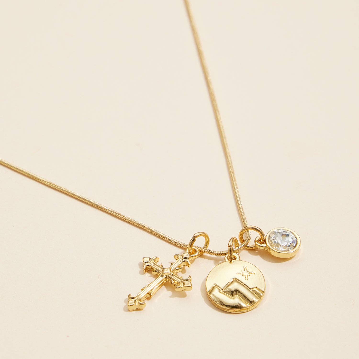 Celebrate your faith and love for adventure with this charming necklace. Featuring a beautifully crafted cross, a mountain scene charm, and a sparkling crystal, this necklace adds a meaningful touch to any outfit. Perfect for daily wear or as a thoughtful gift for someone special, it's a reminder of strength, spirituality, and the journey ahead.
