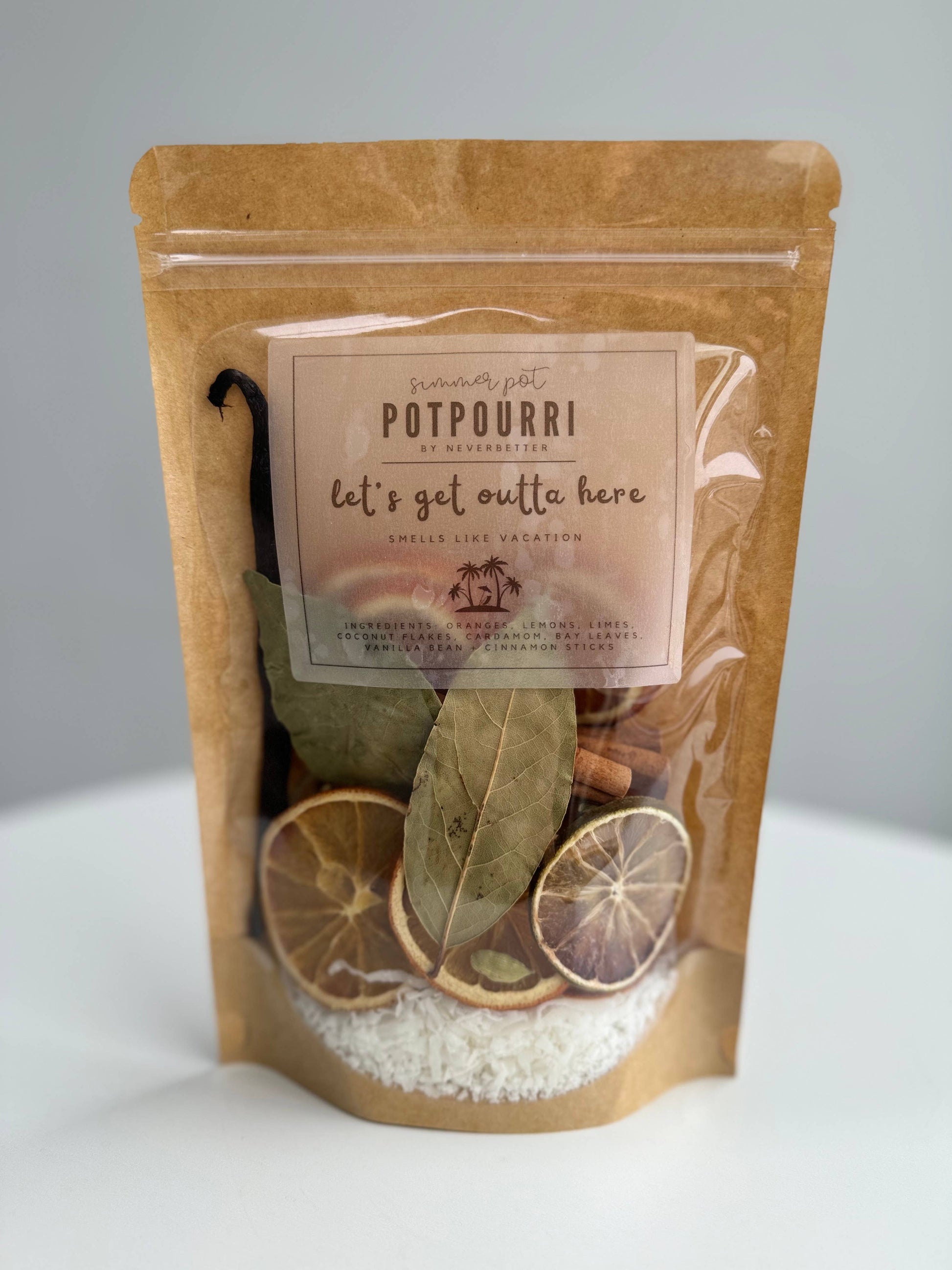 Infuse your space this season with our Let's Get Outta Here Simmer Pot Potpourri. Made with all natural, high quality ingredients. Simply pour contents into a saucepan and add water to cover ingredients. Top off with water periodically. Your home will smell glorious!!