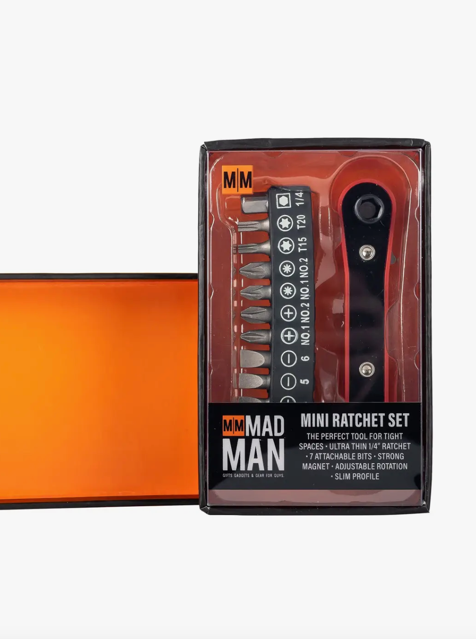 With an ultra thin 1/4” ratchet, 7 attachable bits, a strong magnet, and adjustable rotation, this 7-Piece Mini Ratchet Set is the perfect tool for tight spaces. The slim profile makes it easy to carry and has the functionality to accommodate any application so you can always squeeze in a quick fix.
