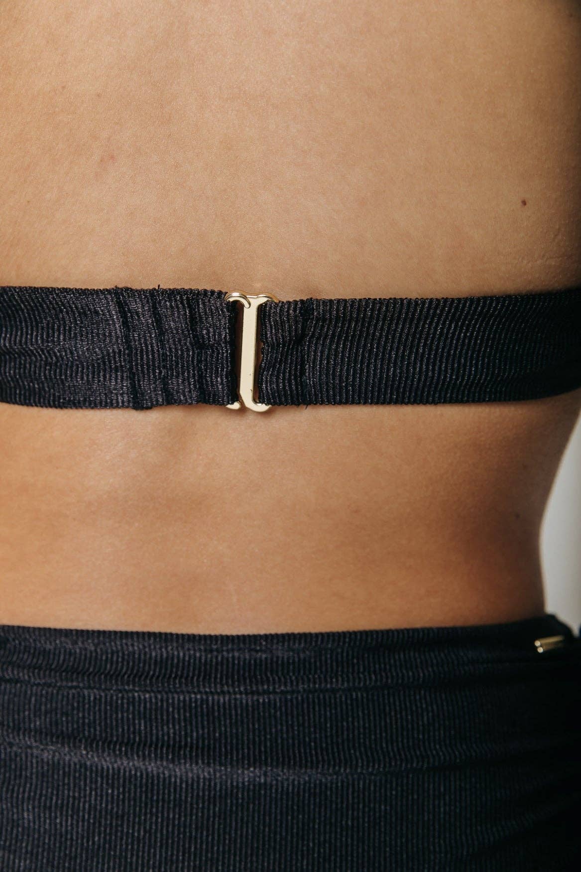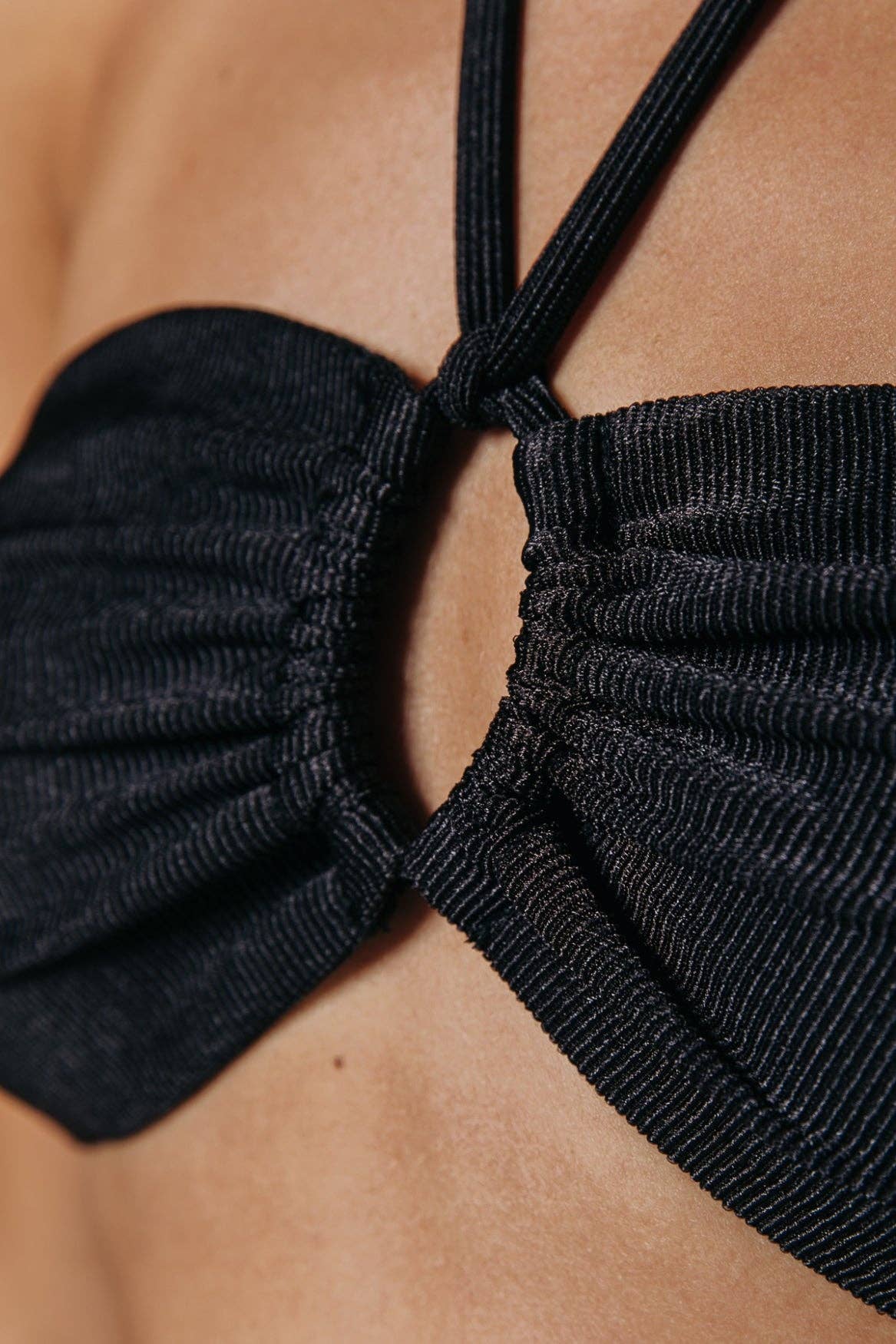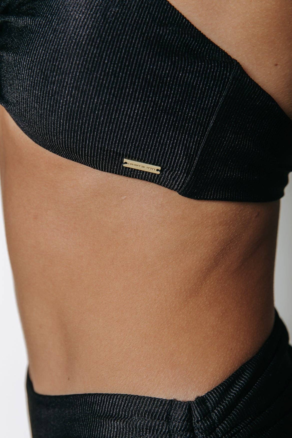 Introducing the Riri Shiny Bikini Top! With its versatile design and padded construction, you can easily change up your look while feeling confident and comfortable. The stunning shiny black fabric is perfect for a day at the lake. Be the envy of everyone with this playful and stylish top.