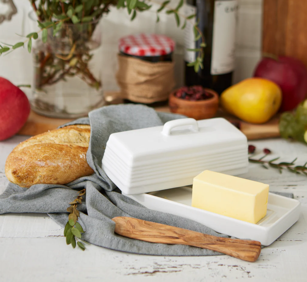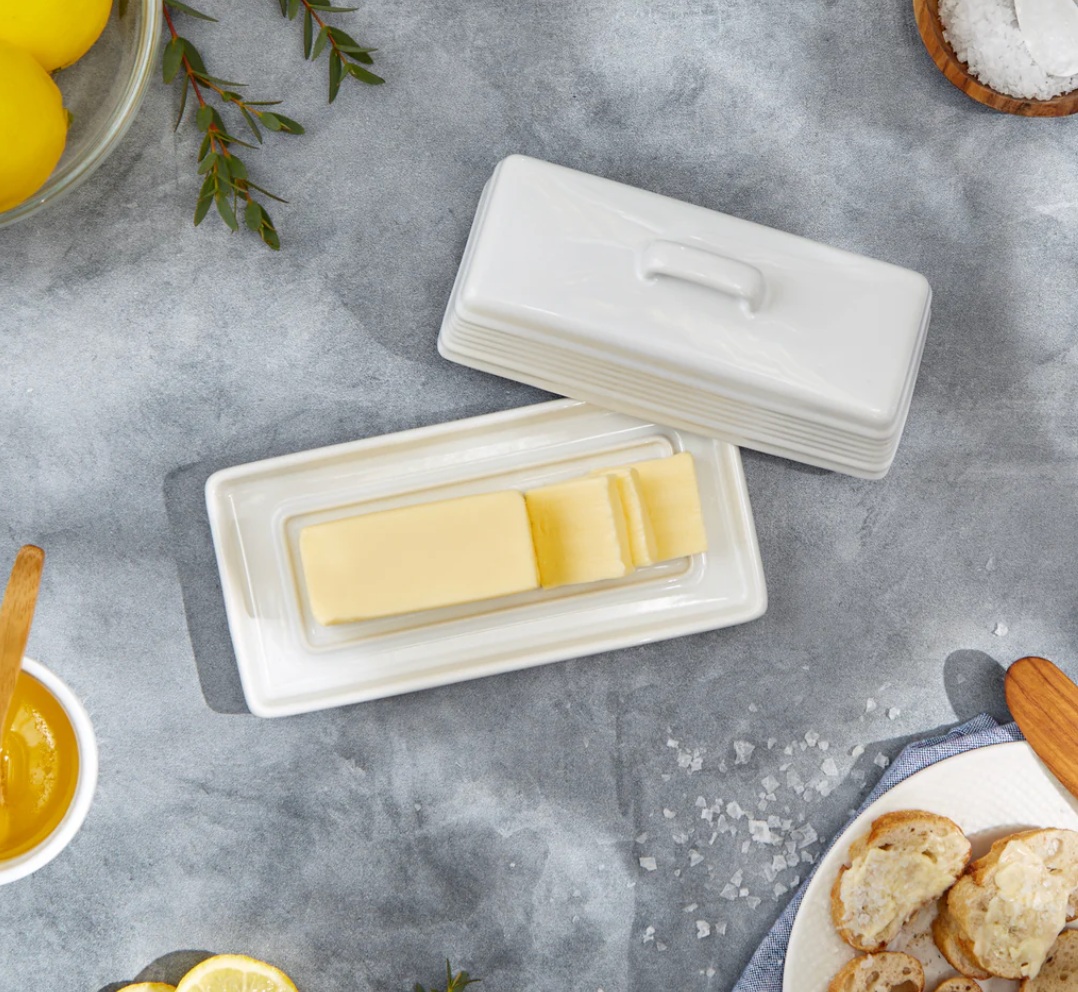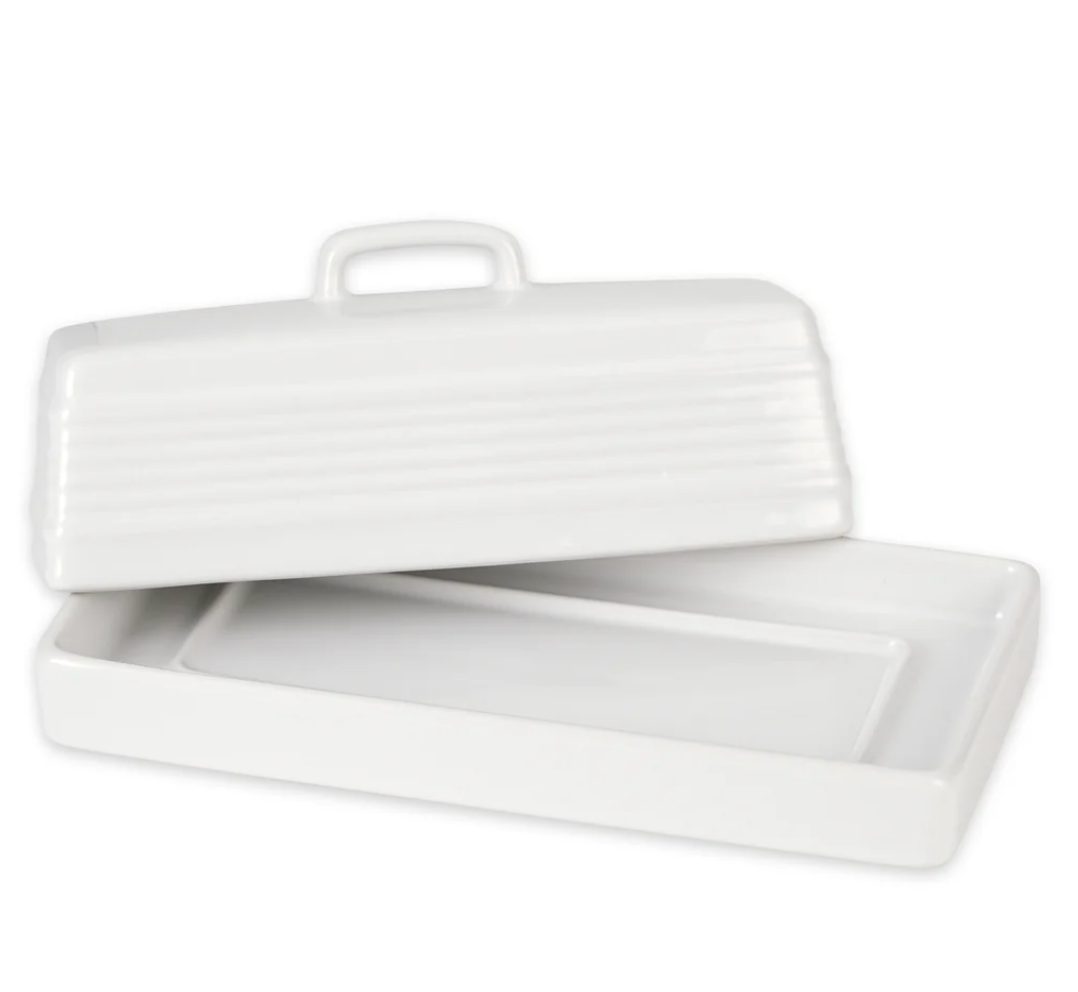 - Made from white stoneware, it features an inner ridge in the tray to keep the butter stationary and the lid securely in place.