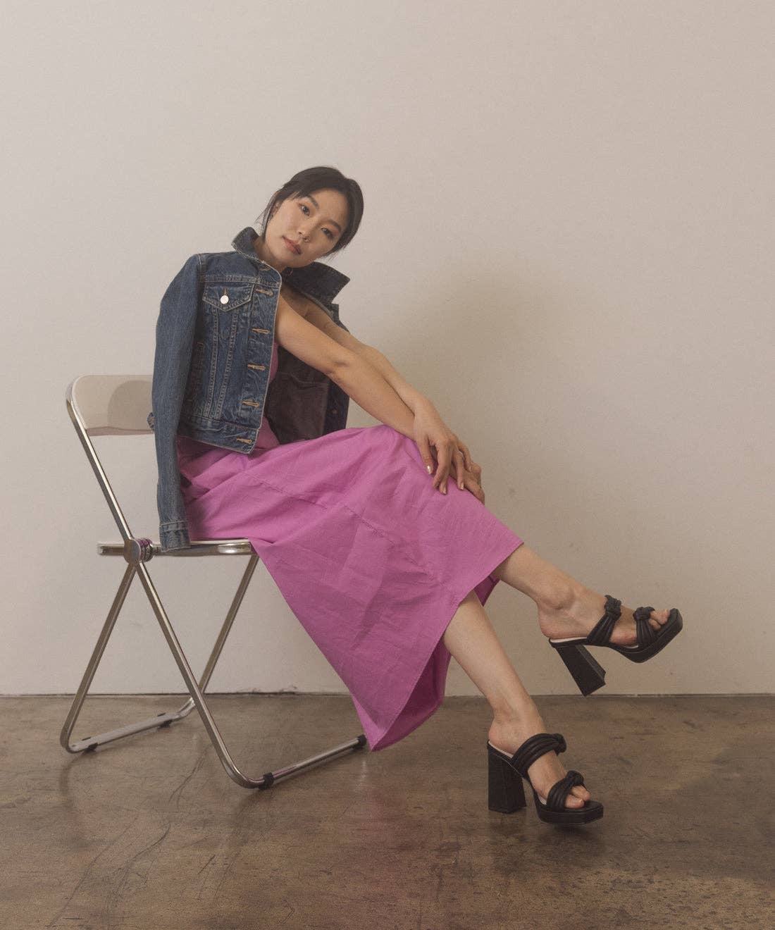 The perfect pairing for any party, this knot platform sandal brings a little edge with a chunky snake-print heel.