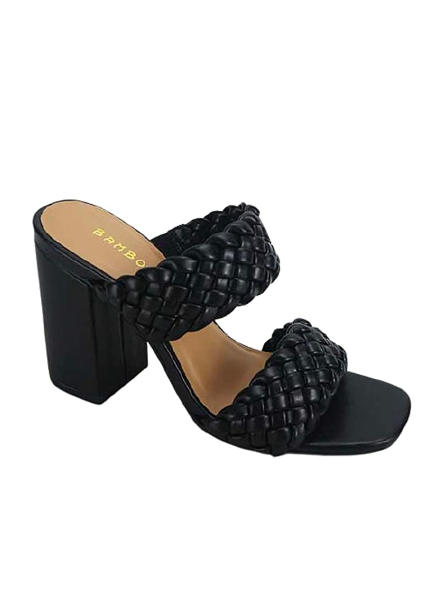 Chunky braided straps add an eye-catching touch to this slide sandal lifted by a block heel.