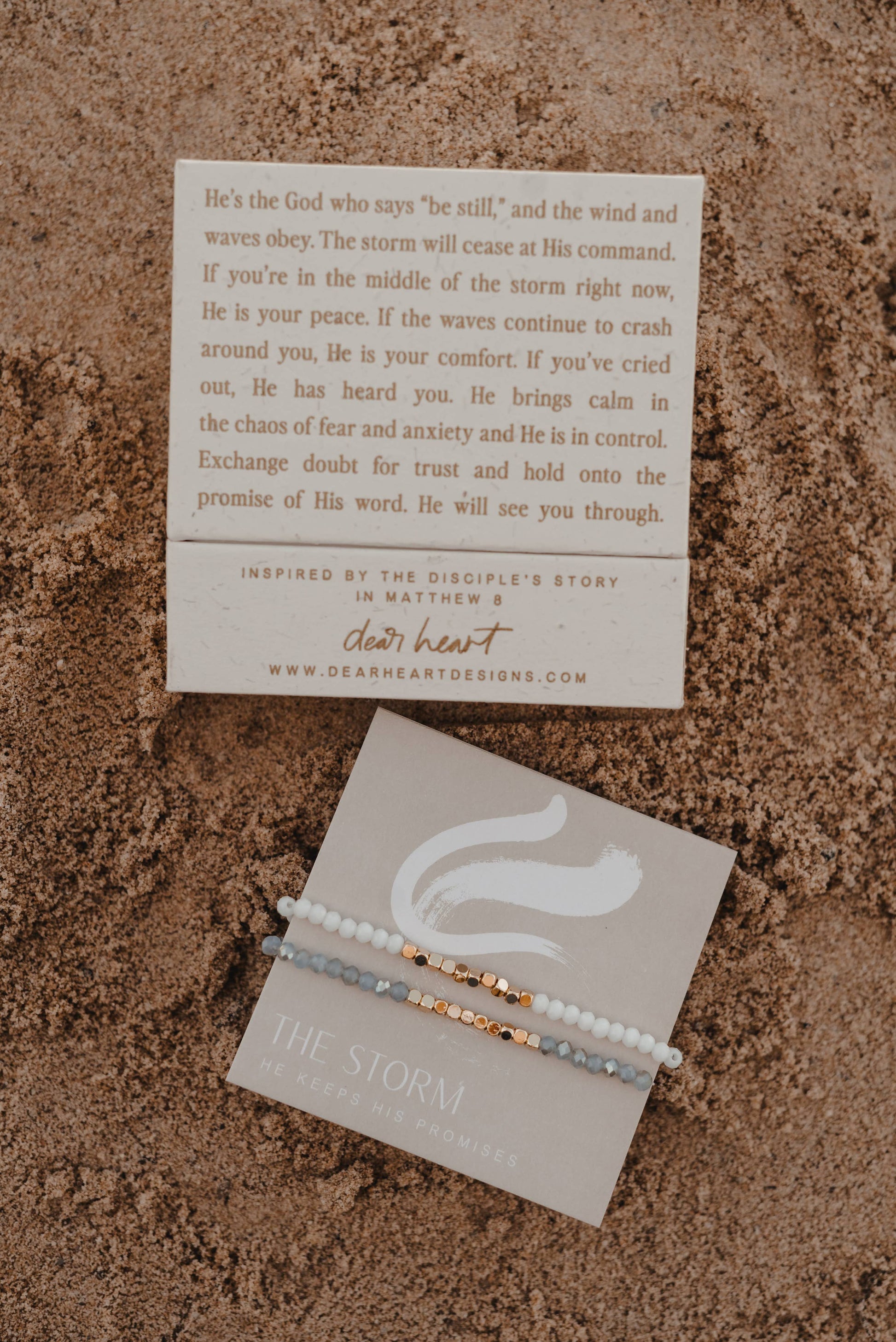 The misty blue bracelet represents the storm that surrounded the disciples in the boat, while the white bracelet represents Jesus calming the storm around them.